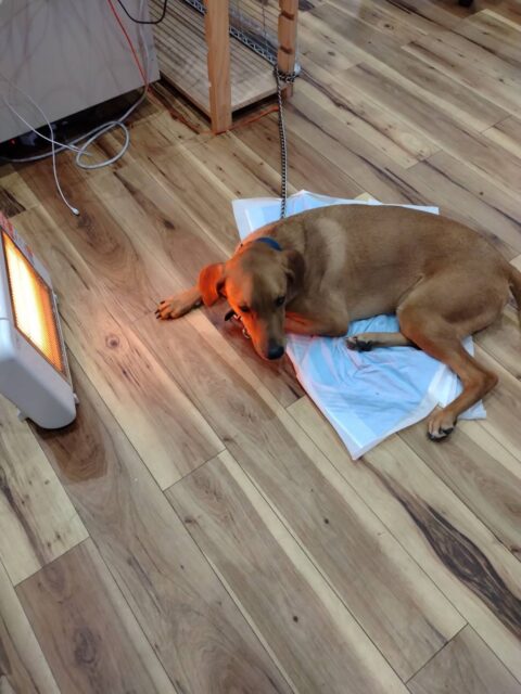 すると、拗ねてしまい、大好きな電気ストーブの前に居座った状態でジーっとこっちを見つめてくるという行動に!
